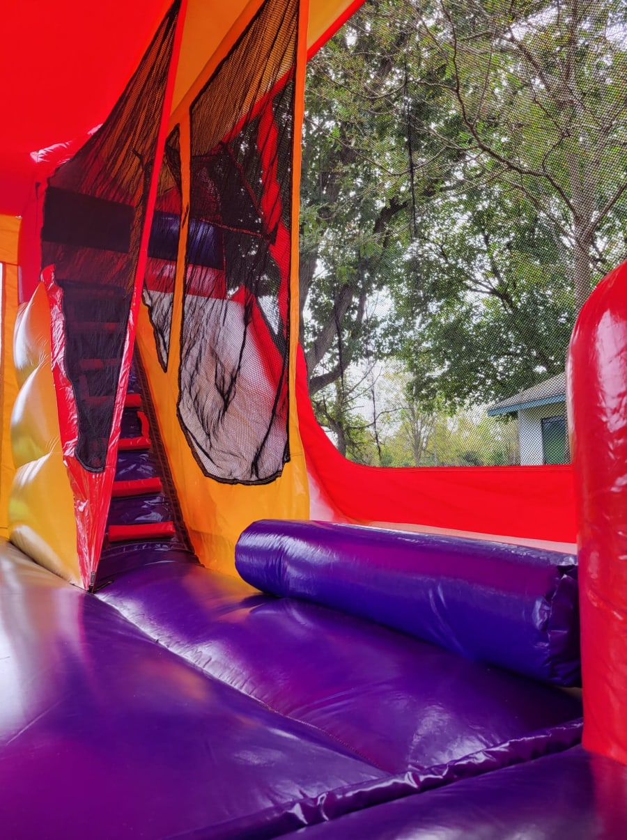 The 4 in 1 Combo challenge is jam-packed with fun, offering a generous area of jumping area, basketball hoop, climb and slide. It has high-visibility mesh around all sides which allows spectators to view easily. This unit can safely accommodate up to 6 participants. With gender neutral colors such as purple, red and yellow, it fits in for any boys and/or girls birthday party, adult cookouts or celebrations and company events.