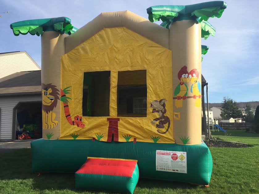 This Jungle Bounce House is decorated with jungle animals and palm trees at the top of each corner. This unit can safely accommodate 5 jumpers at a time and will be sure to please all ages for your children's birthday party, daycare event or backyard celebration. This neutral design is good for girls or boys and is sure to keep them busy for hours! Each side is covered with mesh walls for easy viewing of the bouncers. This unit's convenient size is great for areas with smaller space restrictions. Water is not permitted on this bounce.